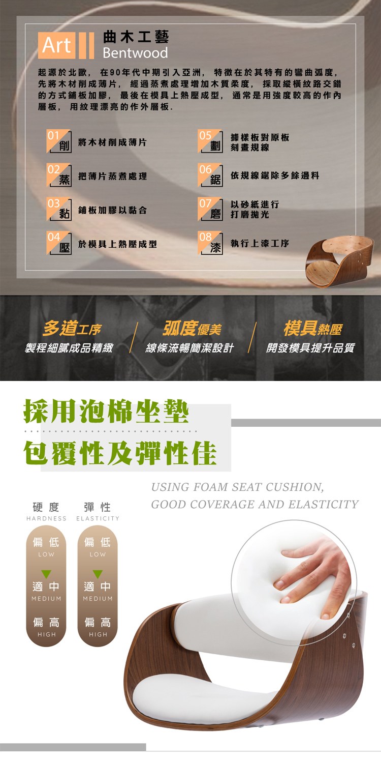 搭配獨特弧形曲木框架質感加乘,採用泡棉坐墊,包覆性及彈性佳,配備美規A級氣壓棒、安全升降,