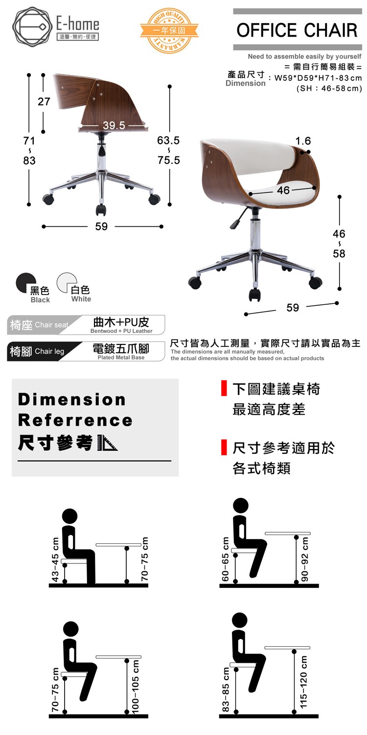 E-home Moroe 莫羅可調式曲木電腦椅 TFC149A-wht 白色 可調高度 360度旋轉 PU皮革透氣 1個