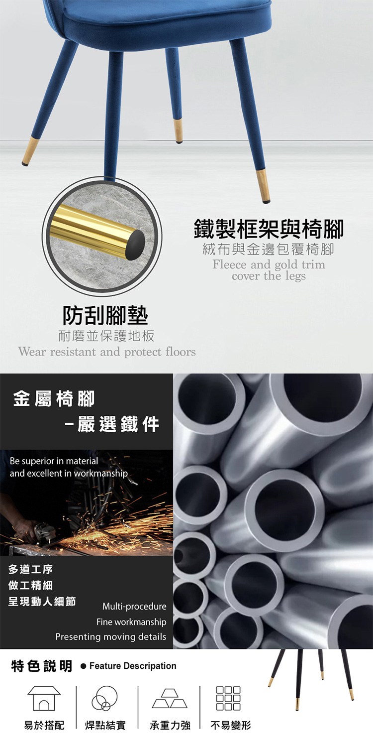 絨布與金邊包覆椅腳,征服視覺,配有塑膠的腳墊、貼心不傷地板,易於搭配的顏色為空間注入創意,
