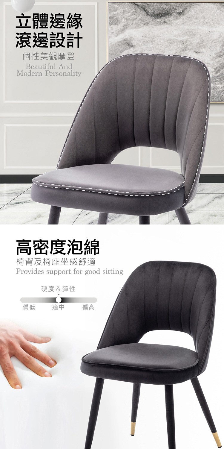 立體邊緣滾邊設計個性美觀摩登,厚實的泡棉椅墊,坐感舒適支撐,鐵製框架與椅腳兼具質感與耐用,