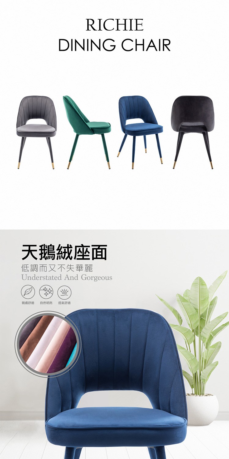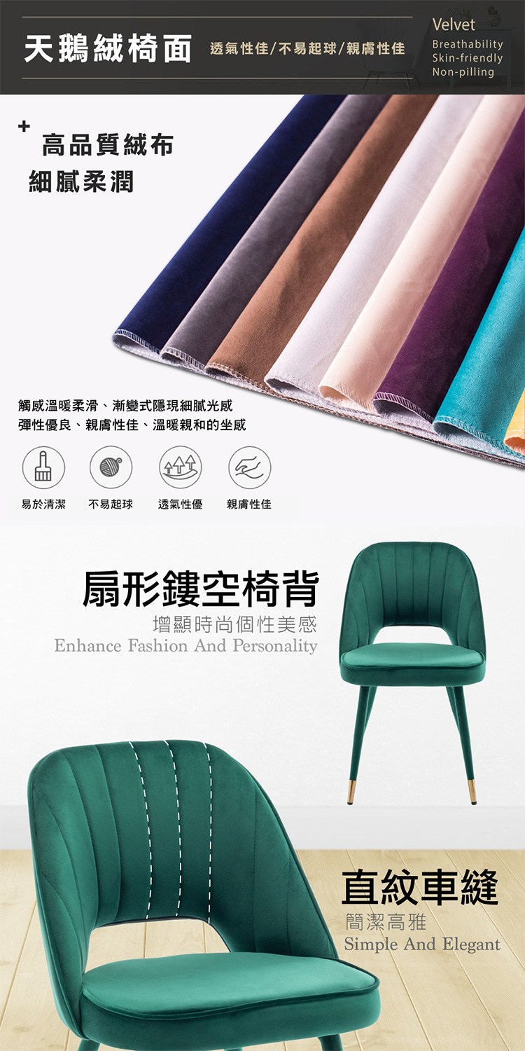 台灣與歐美同步販售、美規設計,低調而又不失華麗的天鵝絨座面,直紋車縫扇形鏤空椅背增顯時尚,