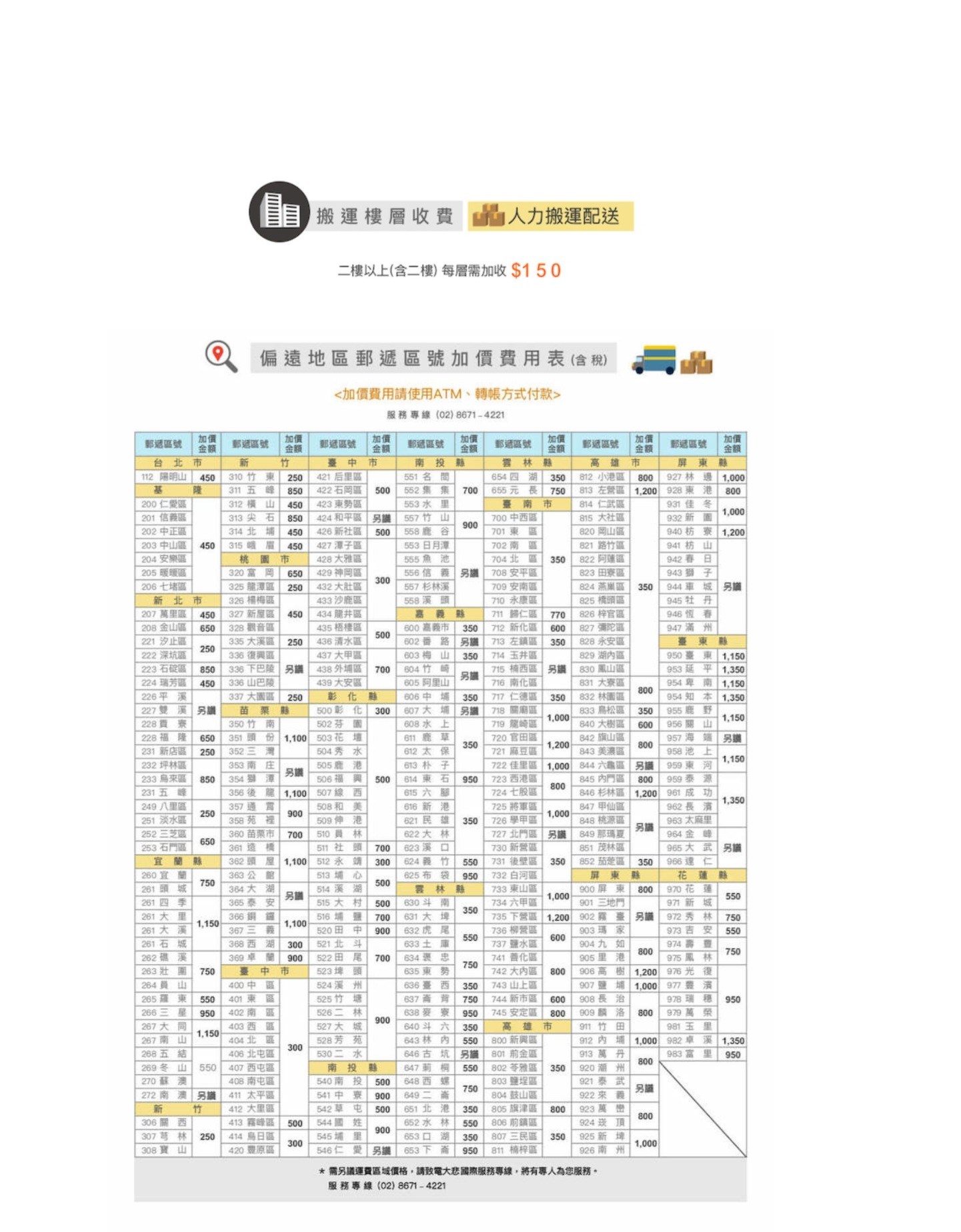 樓層費、跨區費用另計