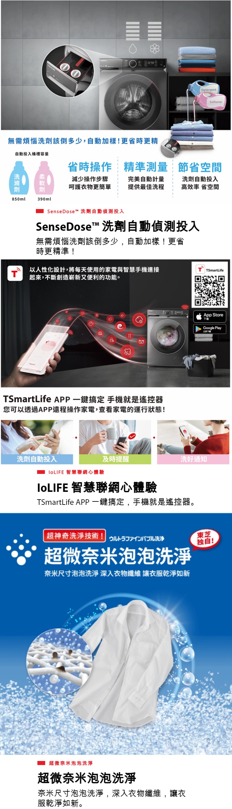 東芝自動偵測投入洗劑,TSmartLIfe 讓家事更輕鬆! 東芝獨家超神奇洗淨技術,超微奈米泡泡! 奈米尺寸泡泡深入衣物纖維,有效減少衣物汗漬、皮脂、黃斑殘留!