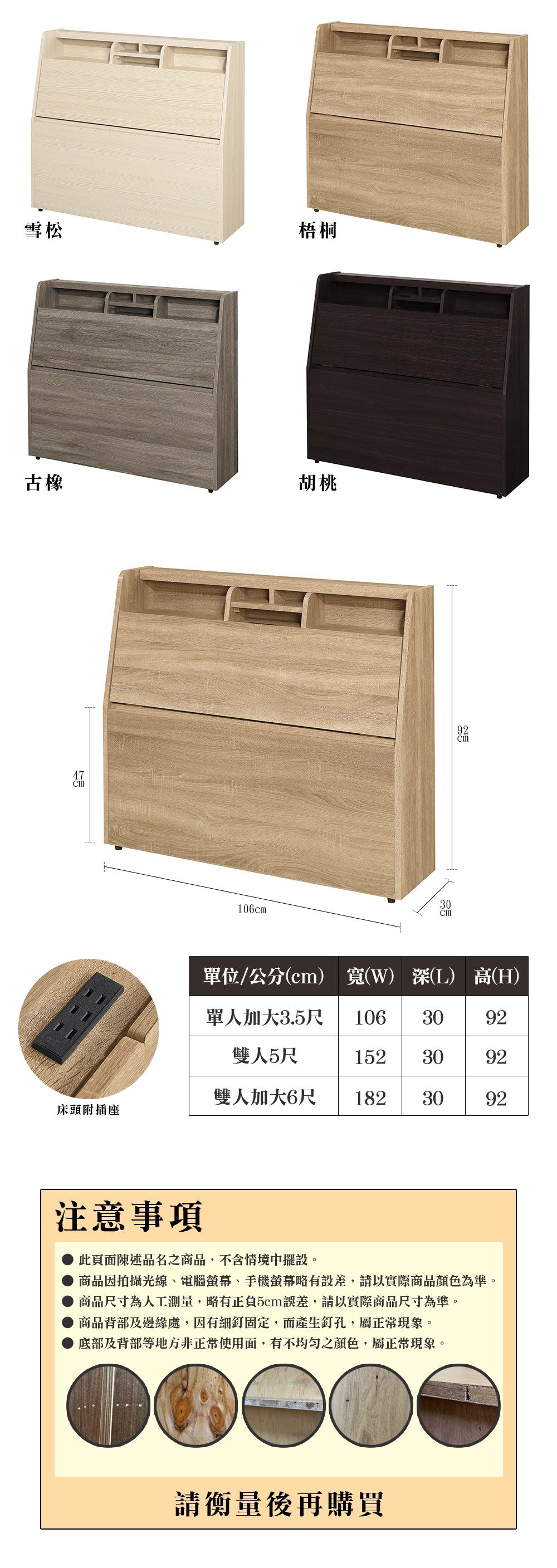 【顛覆設計】樹願插座收納床頭箱(單大3.5尺)古橡色