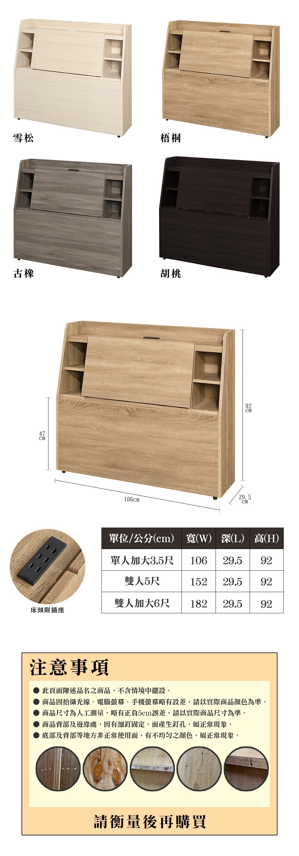 【顛覆設計】樹願插座收納床頭箱(單大3.5尺)古橡色