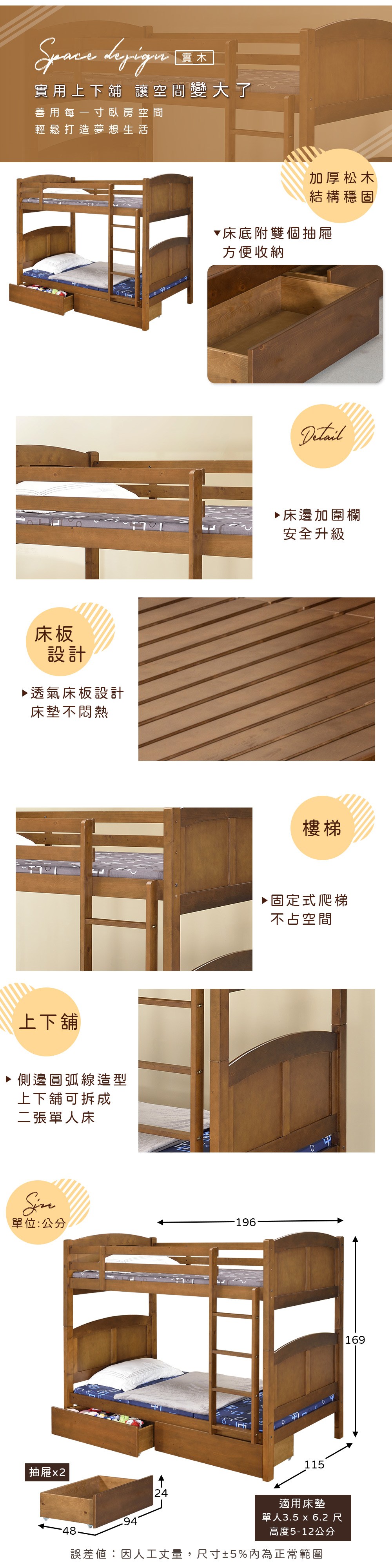 Homelike 喜家居胡桃色實木雙層床(附抽屜x2)(2252)