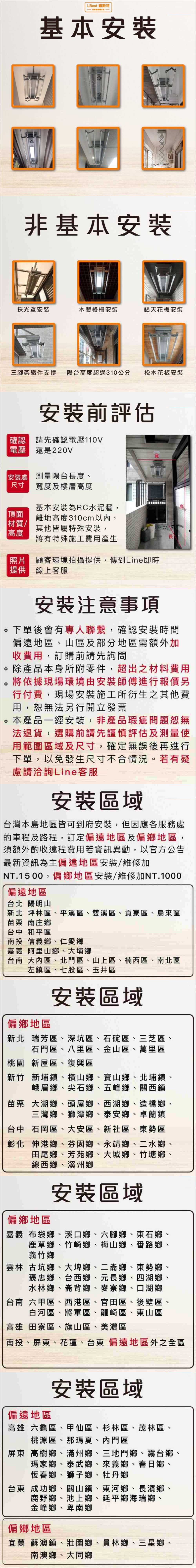 ● 基本安裝 : 一般RC水泥牆面,樓高限高3.2米,不含拆除舊有曬衣架拆除與回收。