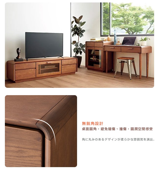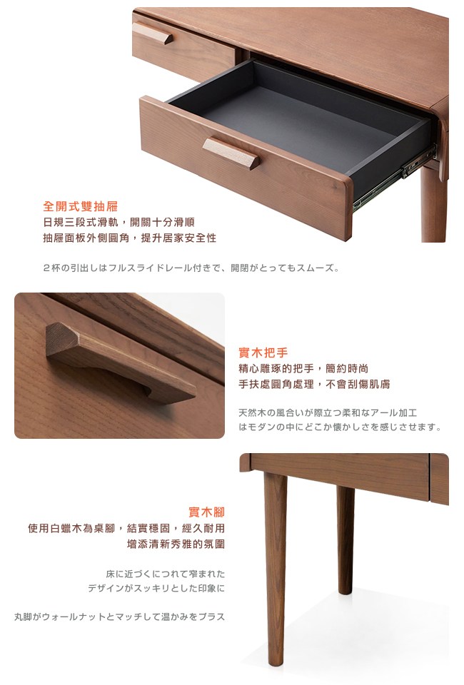 白蠟木清晰風雅的木紋,帶來和式空間的寧靜感受。耐衝擊性強(美國職棒球棒的主流材料),堅固穩定,經久耐用。桌面無銳角設計,避免碰傷、撞傷,圓潤空間的感受。全開式雙抽屜,開關十分滑順。抽屜面板外側圓角,提升居家安全性。精心雕琢的實木把手,簡約時尚,手扶處圓角處理,不會刮傷肌膚。使用白蠟木為桌腳,結實穩固,經久耐用,增添清新秀雅的氛圍。