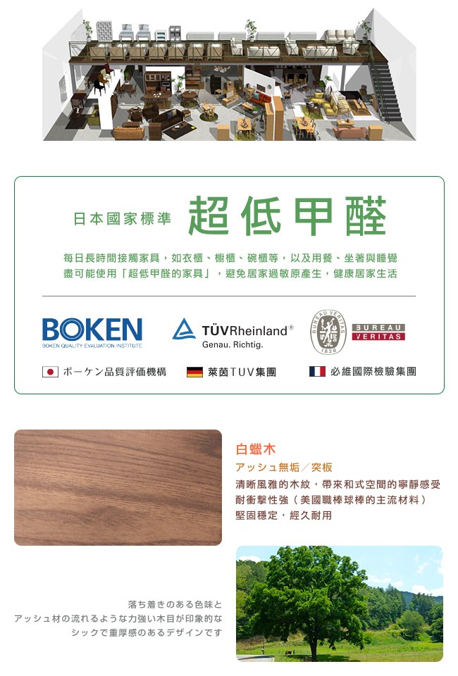 每日長時間接觸家具,如衣櫃、櫥櫃、碗櫃等,以及用餐、坐著與睡覺,盡可能使用「超低甲醛的家具」,避免居家過敏原產生。大丸家具通過日本 BOKEN、德國萊茵 TUV 集團、法國必維國際檢驗集團與多國安全認證,確保每一個家具都是最高品質,符合日本國家標準「超低甲醛」,讓居家環境健康舒適。
