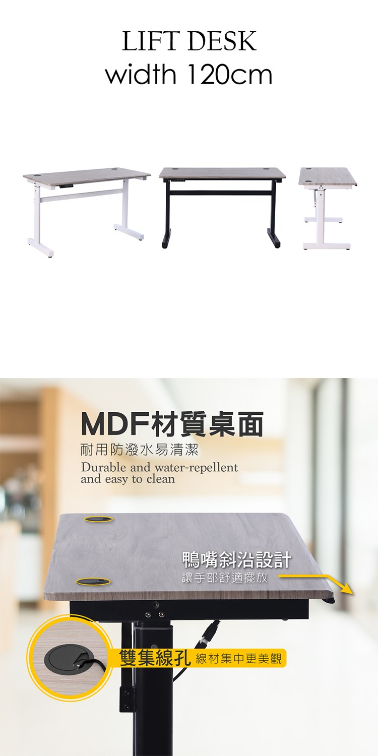 台灣與歐美同步販售、美規設計,桌面採MDF材質耐用防潑水易清潔,正面鴨嘴斜沿設計讓手部舒適擺放,