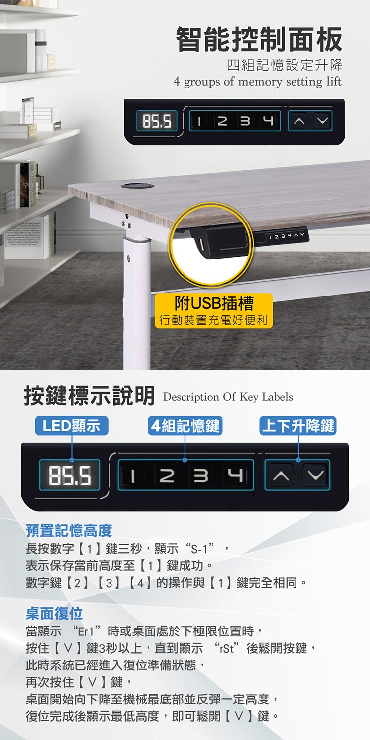 雙集線孔設計讓線材更集中與美觀,智能控制面板,四組記憶設定升降,附USB插槽,行動裝置充電好便利,