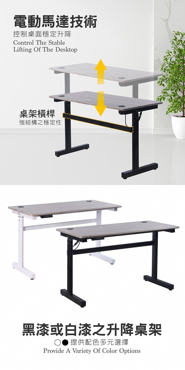 電動馬達技術可控制桌面穩定升降,黑漆或白漆之升降桌架、多元選擇,桌架中間的橫桿加強結構之穩定性,