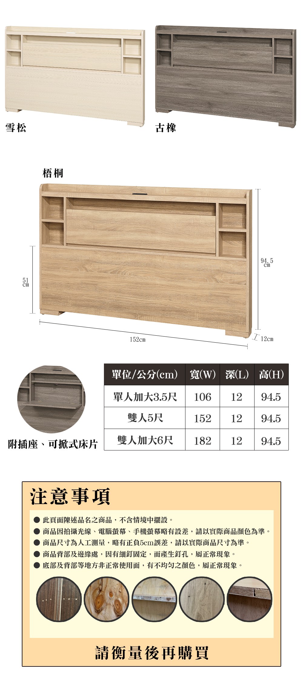 【多瓦娜】派克5尺床頭片(附插座)-三色白梧桐
