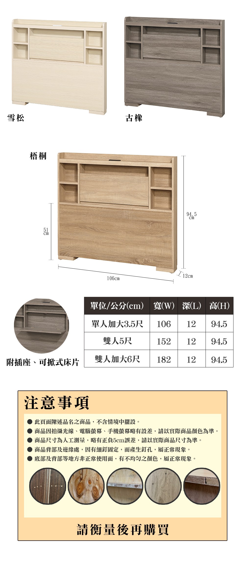 【多瓦娜】派克5尺床頭片(附插座)-三色白梧桐