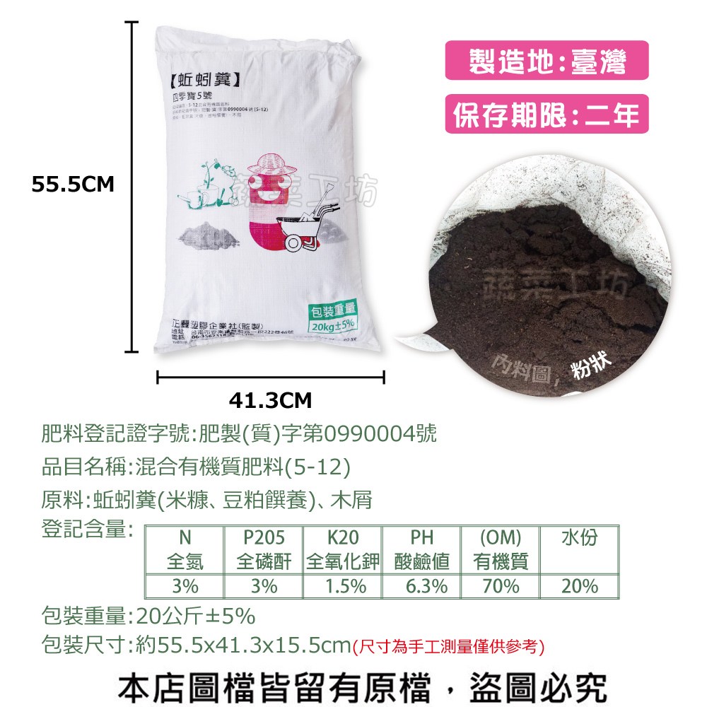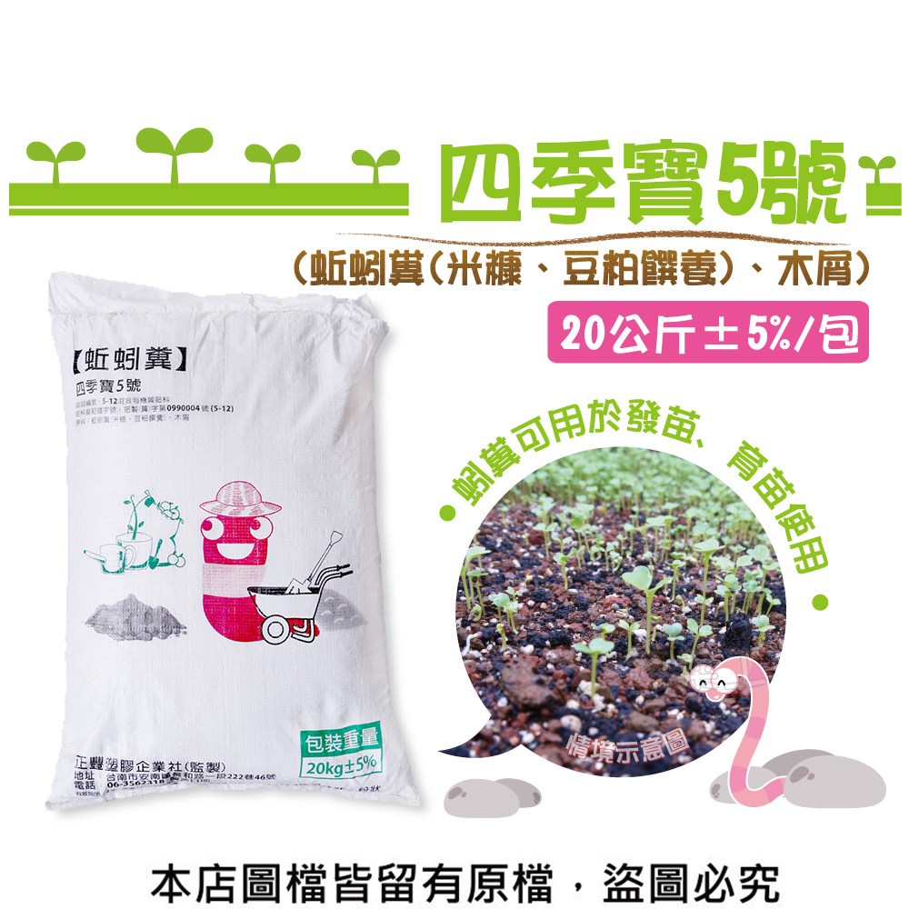 【蔬菜工坊】四季寶5號 20公斤 (蚯蚓糞(米糠、豆粕餵養)、木屑)