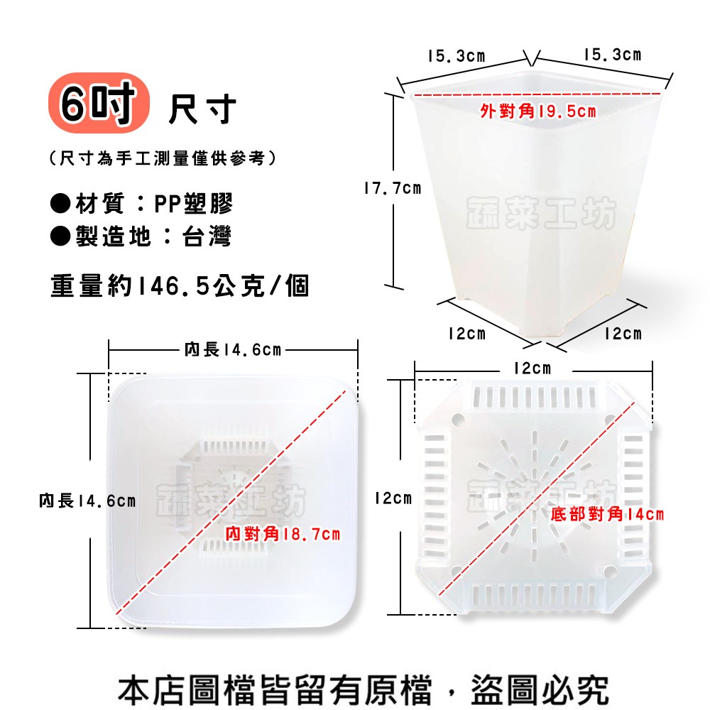 【盆外】長約15.3*寬15.3*高17.7公分,外對角19.5公分