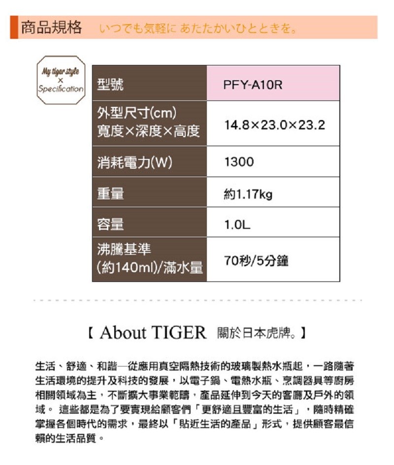 TIGER虎牌 1.0L電氣快煮壺 PFY-A10R