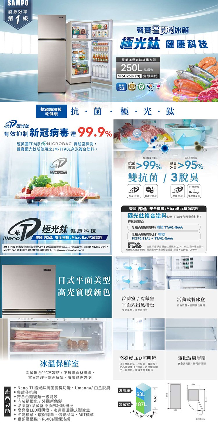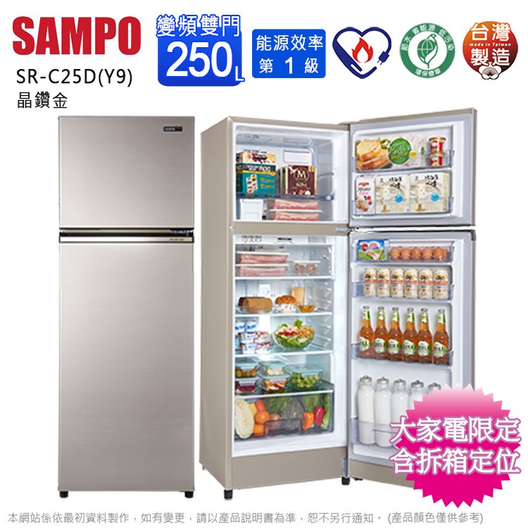SAMPO聲寶250公升一級變頻雙門冰箱 SR-C25D(Y9)~含拆箱定位+舊機回收