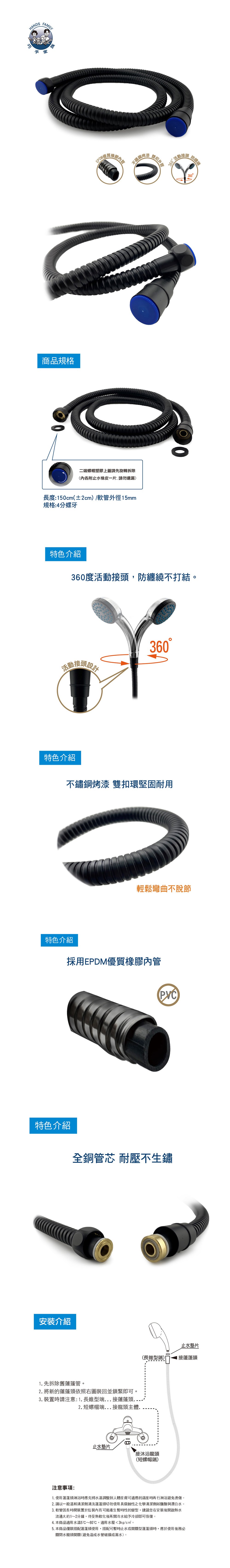 德利生活 蓮蓬頭PVC軟管 黑色 1條
