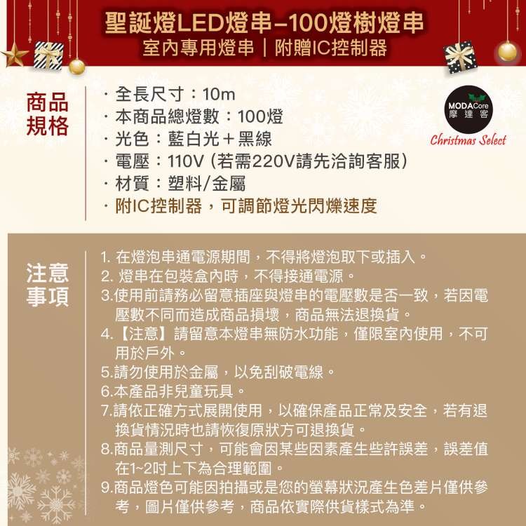 MODACore 摩達客 LED燈串 聖誕燈 100燈 附控制器 營造聖誕溫暖氣氛 高亮度低熱量長壽命 低耗電 白光 + 黑線 1組