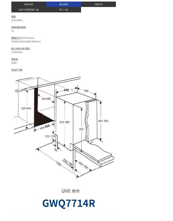 GlemGas 全嵌洗碗 45cm GWQ7714R(跨區費另計)電壓 220V/60Hz