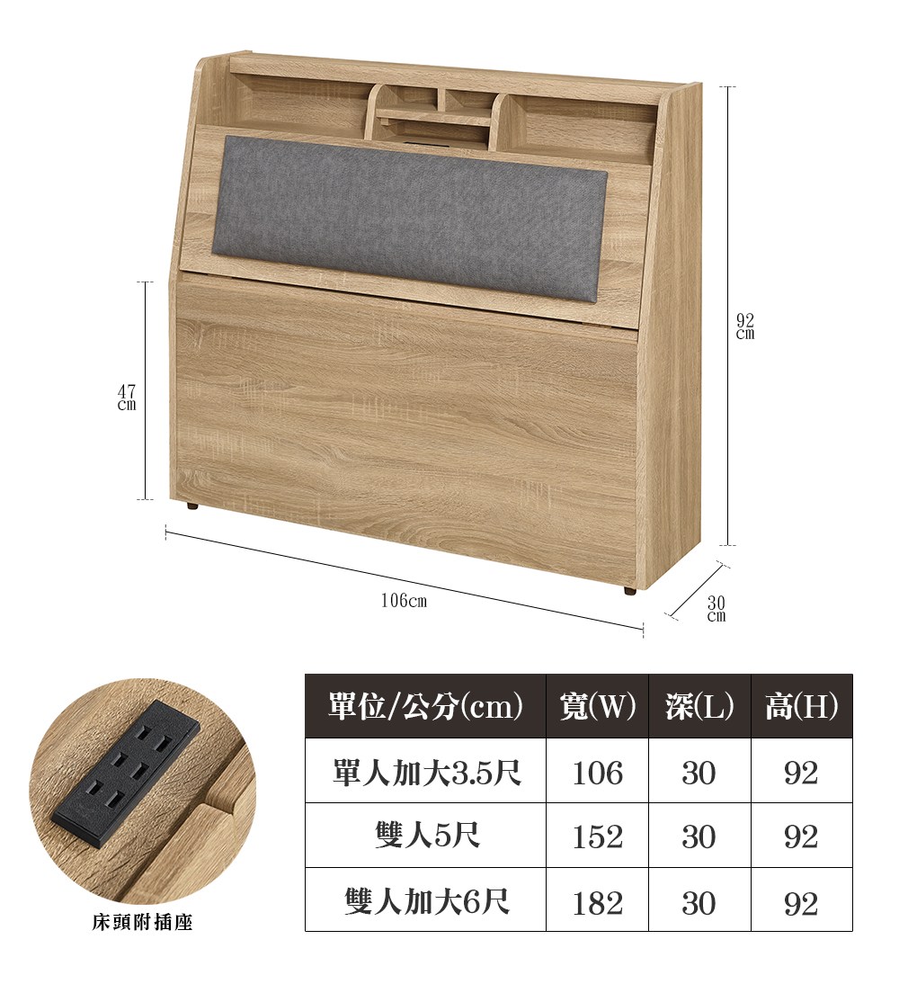 【多瓦娜】派克5尺床頭片(附插座)-三色白梧桐