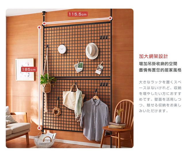 台灣製造,日本同步販售。不佔空間,實用收納,安裝高度的範圍215~312cm。可佈置於玄關、客廳、房間、廚房、浴室、畫室、藝廊。使用日規頂天防震固定器,專為耐震防落的彈簧結構,讓收納網架彈性緩衝,吸收震動,更加安全穩固,不易傾倒。支架獨立可調高度,能在不同高度落差下(如樑柱)安裝收納架。內六角螺絲,相對十字形螺釘,它有六個受力面,能鎖的更緊密不滑牙,結構更加牢固。加大網架設計,增加吊掛收納的空間,盡情佈置您的居家風格。附贈日規掛鉤20入,與S掛鉤不同,它不會搖晃,方便吊掛物品不掉落,每一個承重 0.5kg。