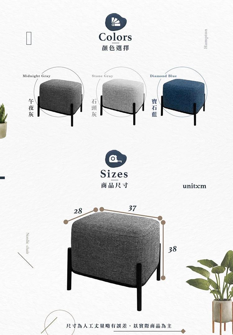 【Hampton 漢汀堡】維克布面小方凳-多色可選石頭灰