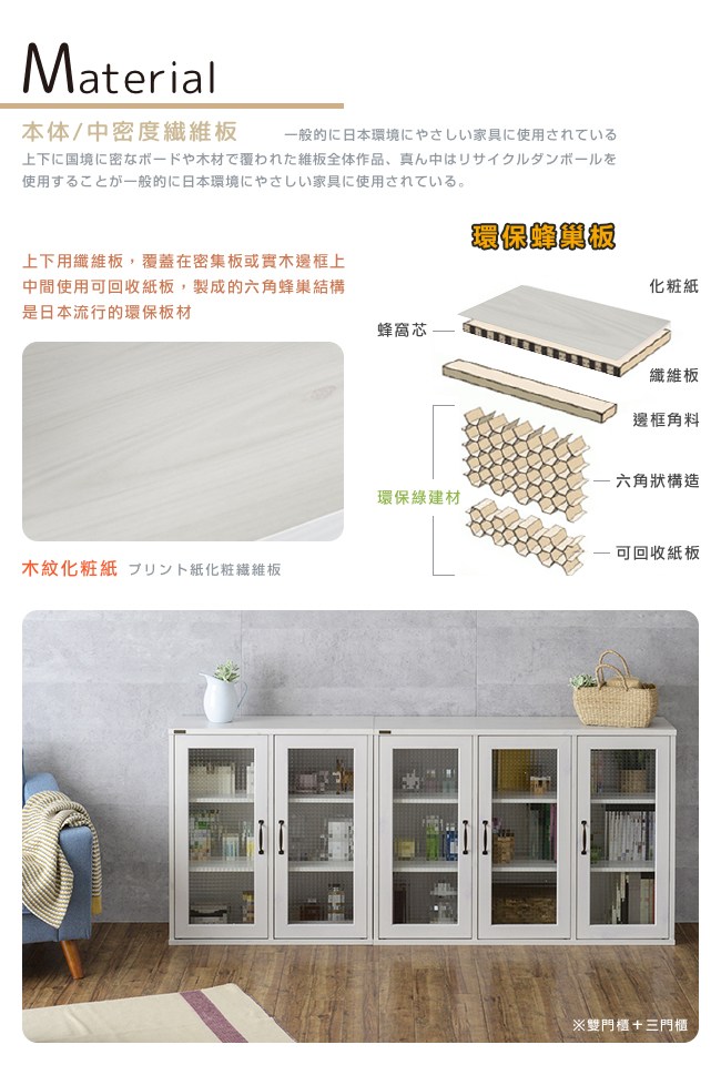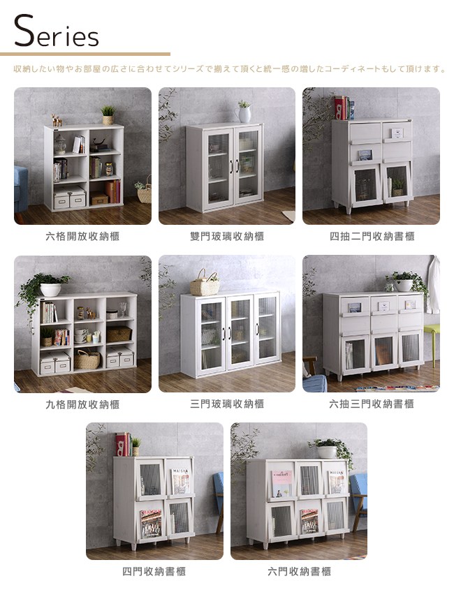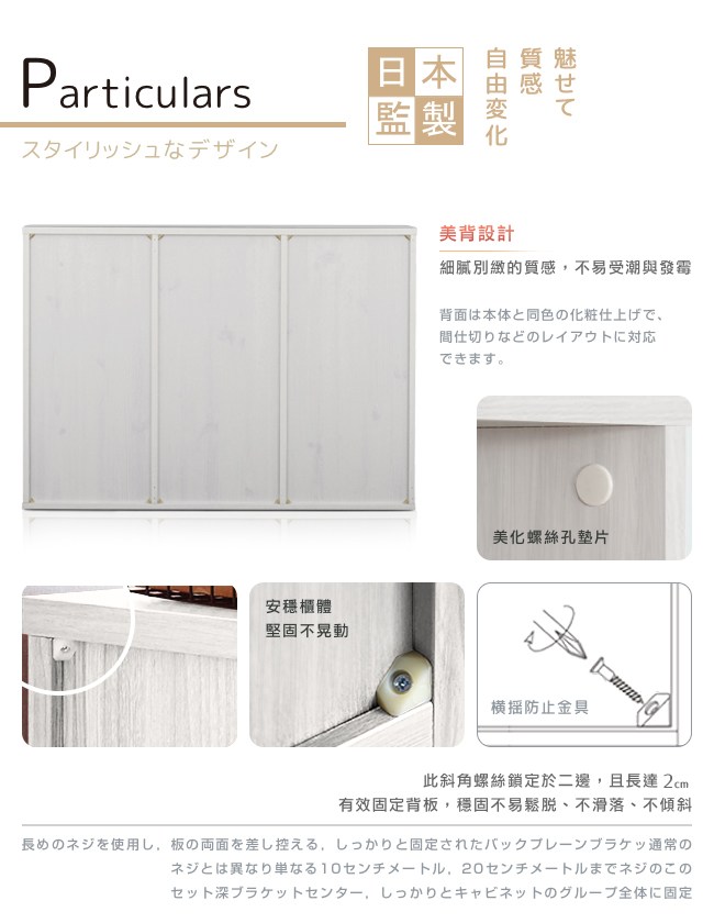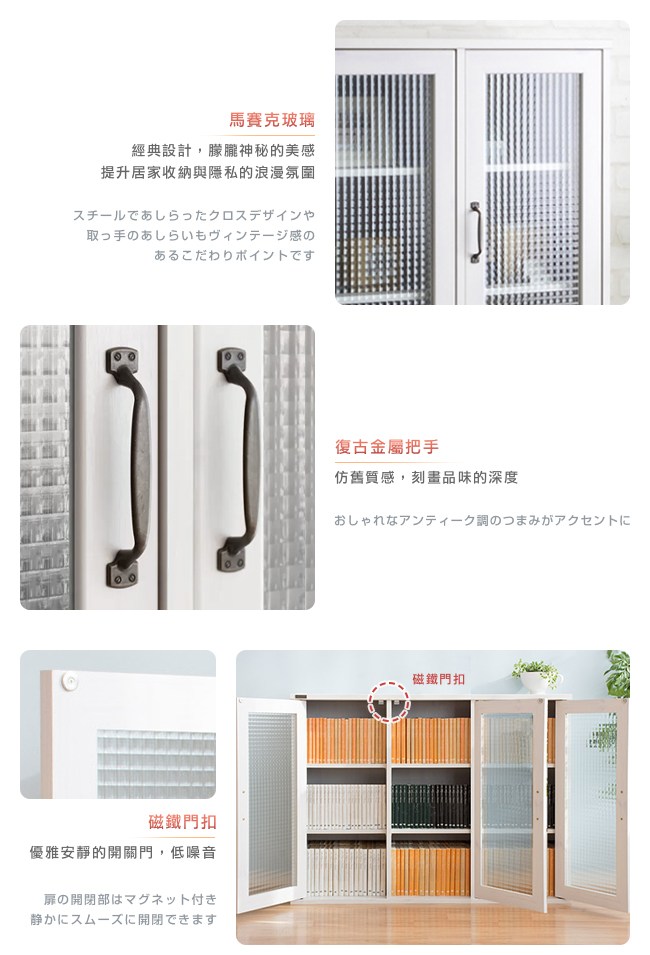 日本傢俱品牌,台灣同步販售。置物櫃不再一成不變,有了新書、新相框或公仔,改變層板排列方式,增添居家佈置巧思。白色木紋天板,餘裕的置物空間,方便暫放東西,生活有條不紊。馬賽克玻璃,經典設計,朦朧神秘的美感,提升居家收納與隱私的浪漫氛圍。復古金屬把手,仿舊質感,刻畫品味的深度。磁鐵門扣,降低關門的噪音。依物品、書本尺寸,調整層板高度,自訂收納格大小。層板與櫃體透過金屬卡榫組合,簡單調整層板位置。美背設計,不易受潮與發霉。背板的斜角固定法,更加安穩櫃體的結構。美化螺絲孔墊片,增添細膩別緻的質感。