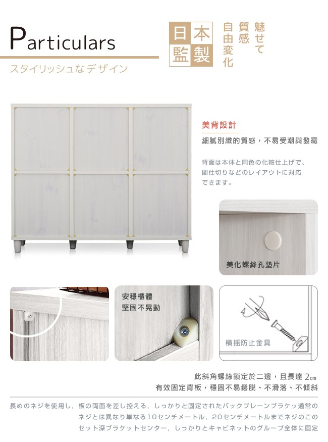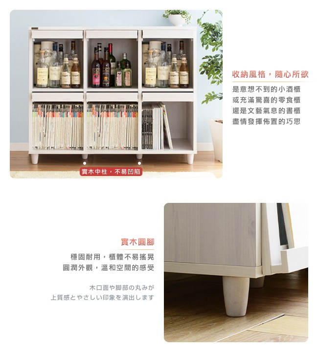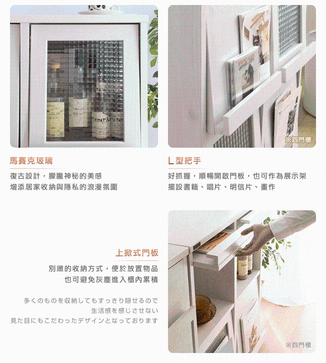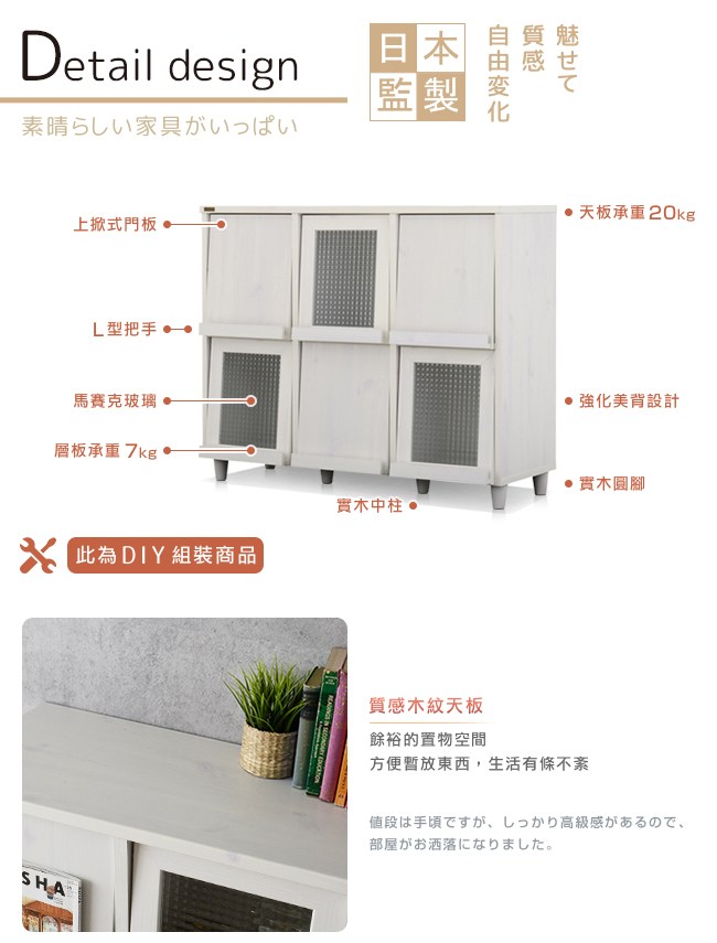 日本傢俱品牌,台灣同步販售。是意想不到的小酒櫃?或充滿驚奇的零食櫃?還是文藝氣息的書櫃?盡情發揮佈置巧思。白色木紋天板,餘裕的置物空間,方便暫放東西,生活有條不紊。馬賽克玻璃,復古設計,朦朧神秘的美感,增添居家收納與隱私的浪漫氛圍。L型把手好抓握,順暢開啟門板,也可作為展示架使用,擺設書籍、唱片、明信片、畫作等。上掀式門板,別緻的收納方式,便於放置物品。也可避免灰塵進入櫃內累積。美背設計,不易受潮與發霉。背板的斜角固定法,更加安穩櫃體的結構。美化螺絲孔墊片,增添細膩別緻的質感。底座實木中柱,不易凹陷變形。實木圓腳穩固耐用,櫃體不易搖晃。