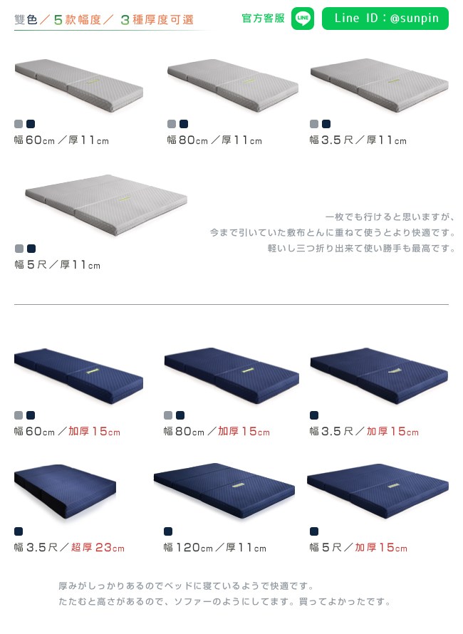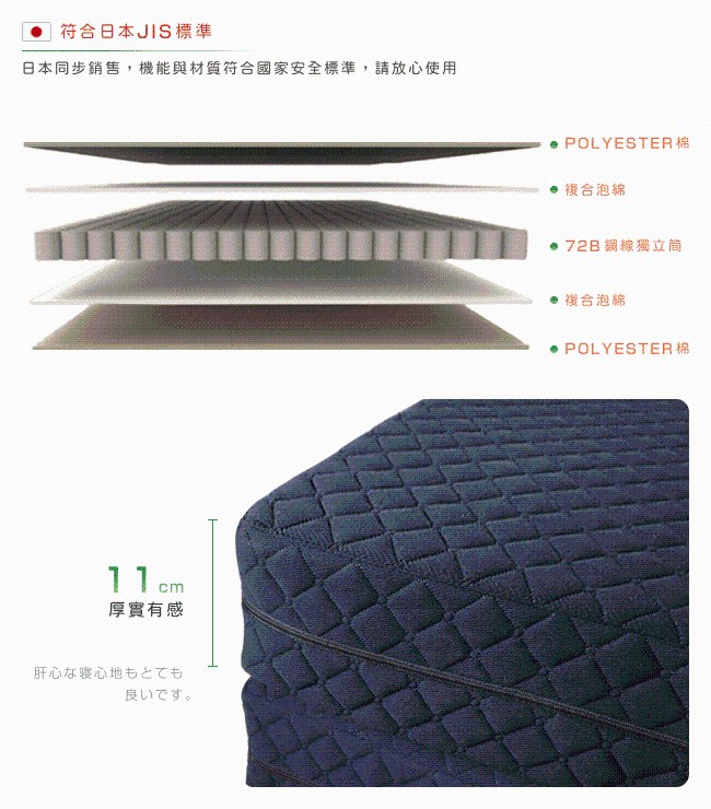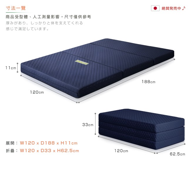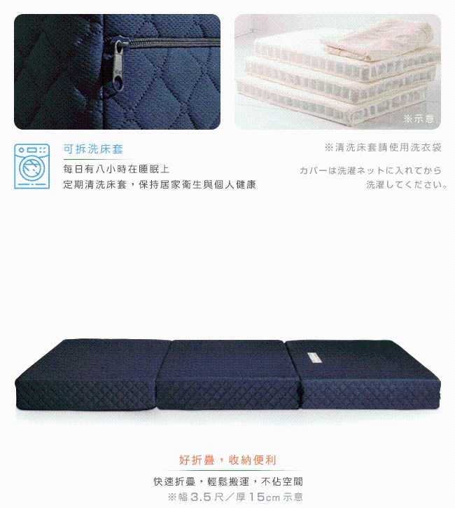 台灣製造,日本同步販售,品質安心。三折設計,方便展開與折疊床墊,快速簡單便可佈置完成。床墊厚度11cm,薄型設計,省空間好收納。對於家裡的臥房、客房、兒童房來說,展開就是一張床,折疊起來就是一個座墊。POLYESTER 布料,透氣性佳,好睡舒適,質輕耐磨,經久使用。依據 CNS 7447 國家標準,72B 鋼線獨立筒,具備韌性佳、結構強、耐用久,用於獨立筒床墊是最舒適的硬度。獨立的彈簧,分散體壓,各別配合身形而下沉,保持自然的睡姿,減輕骨骼的壓力。可拆洗床套便於清潔,避免塵蟎、細菌或過敏原滋生。