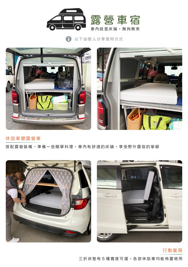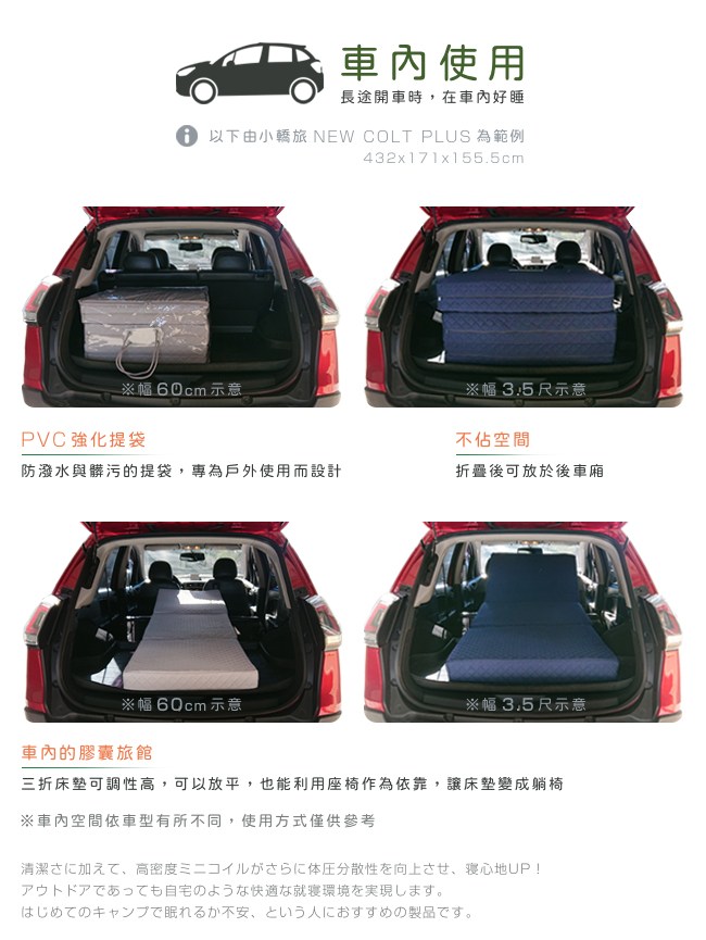 假日與親朋好友愉快的開車出遊、野外露營,充實度過了一整天後,不用再困擾睡的地方是否舒適、擔心睡不好,讓隔天玩得不盡興。【C'est Chic】二代目日式三折獨立筒彈簧床墊-幅120cm,好攜帶、省空間,輕鬆展開便是一張床墊。出門在外,也能享受到獨立筒帶來的良好睡眠品質。在車內使用的話,瞬間成為膠囊旅館,讓露營更加簡單不麻煩。貼心附贈 PVC 強化提袋,防潑水與髒污,專為戶外攜帶使用而設計。