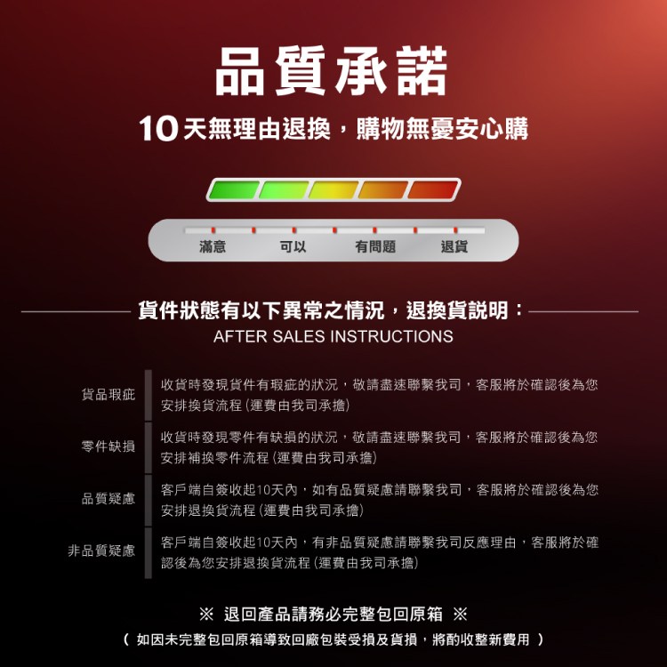 商品如一經組裝後,一律不接受退貨,退貨商品請使用原箱包裝包回,如有缺少配件或紙箱破損(將無法退貨)或是需支付整新費用。