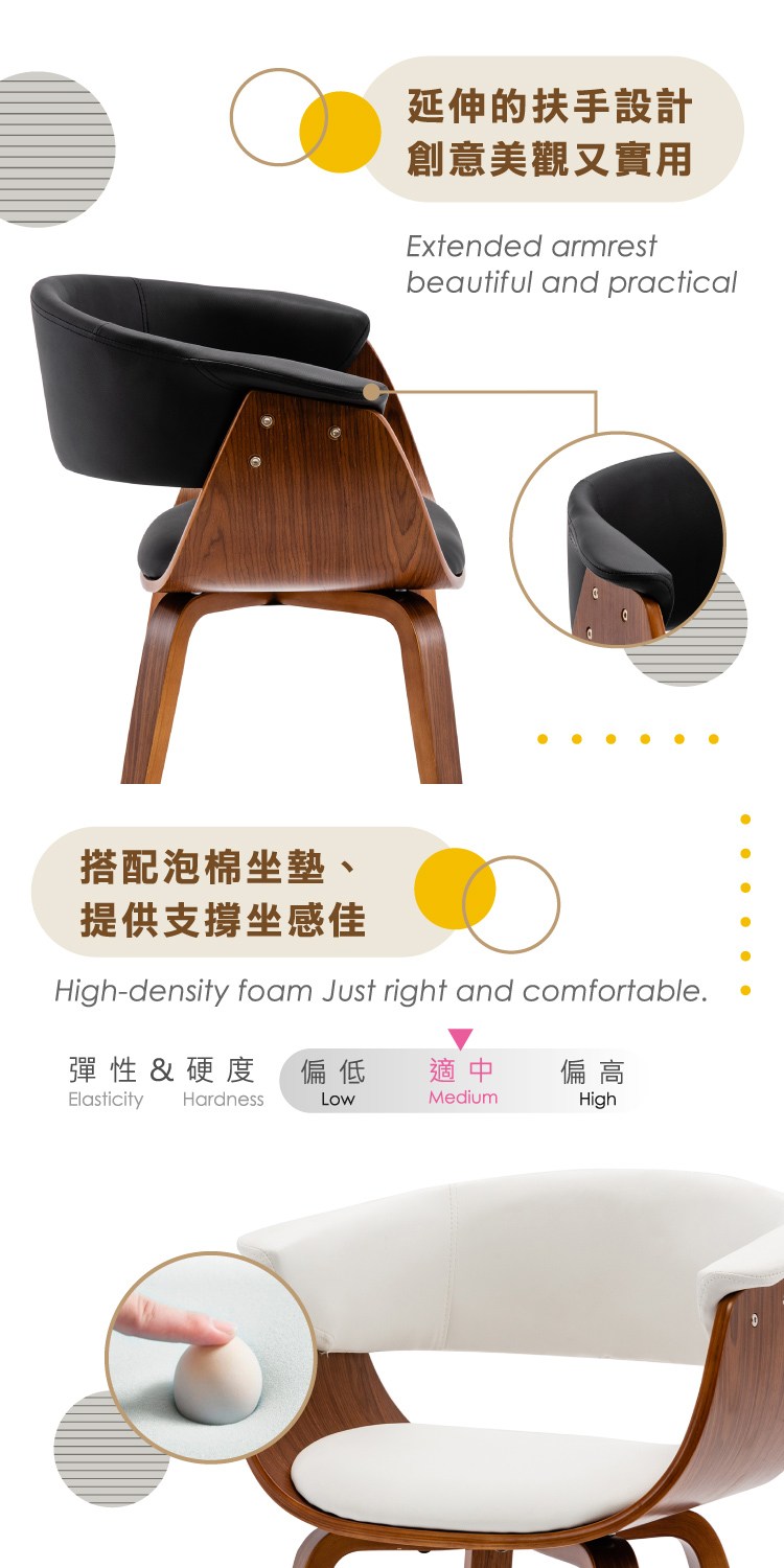延伸的扶手設計創意美觀又實用,搭配泡棉坐墊、提供支撐坐感佳,經典曲木椅座框架成就質感美學,