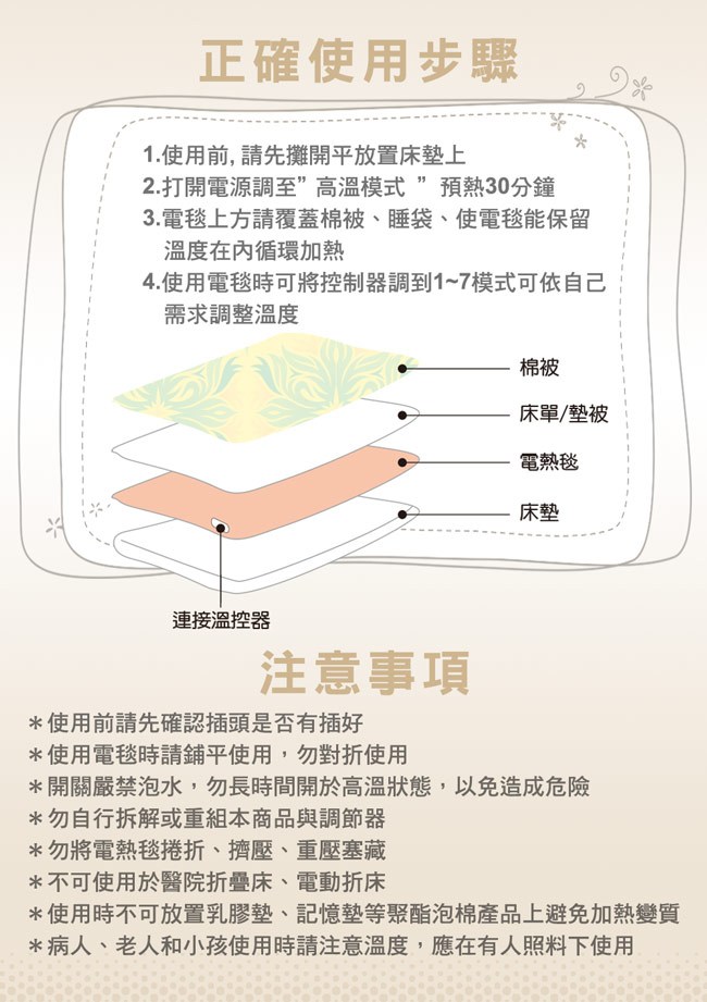 *使用前請將毯體平鋪於床墊上,並檢查毯面和控制器有無破損,控制器插頭和插座確實插入