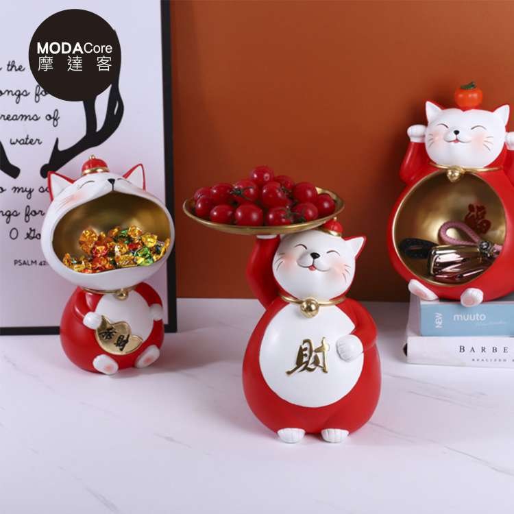 摩達客◉春節開運◉呆萌福氣頂托盤招財貓擺飾(紅色款) 糖果收納聚寶盆