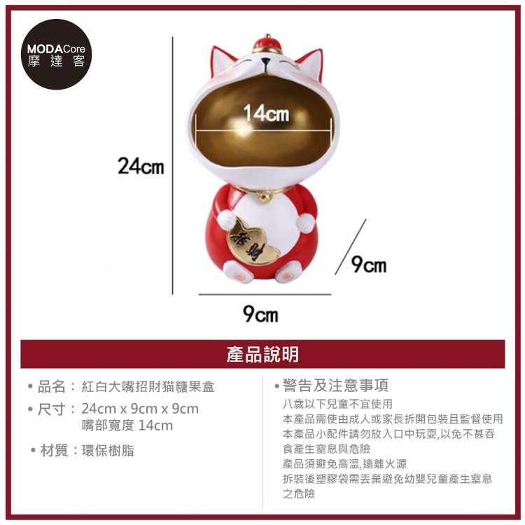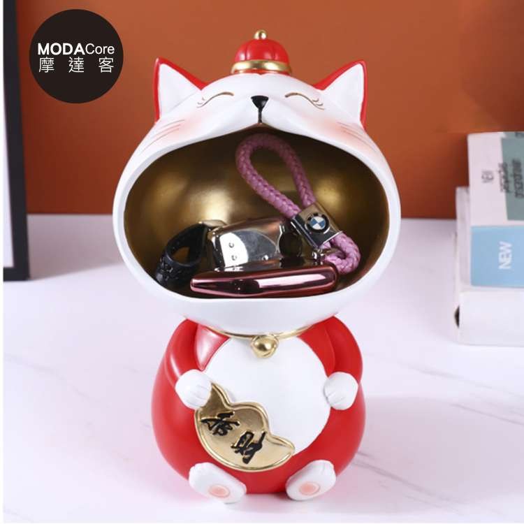 摩達客◉春節開運◉紅白大嘴招財猫擺飾-糖果收納聚寶盆