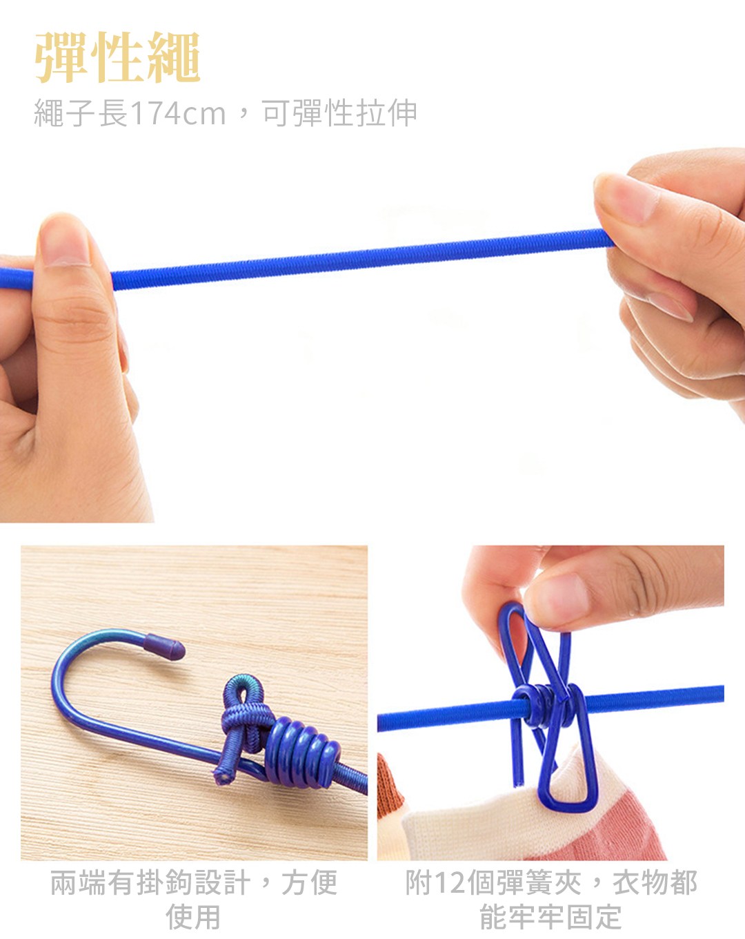 【LIFECODE】彈性晾衣繩/露營旅遊曬衣幫手-附12個夾子(2入)-3色可選