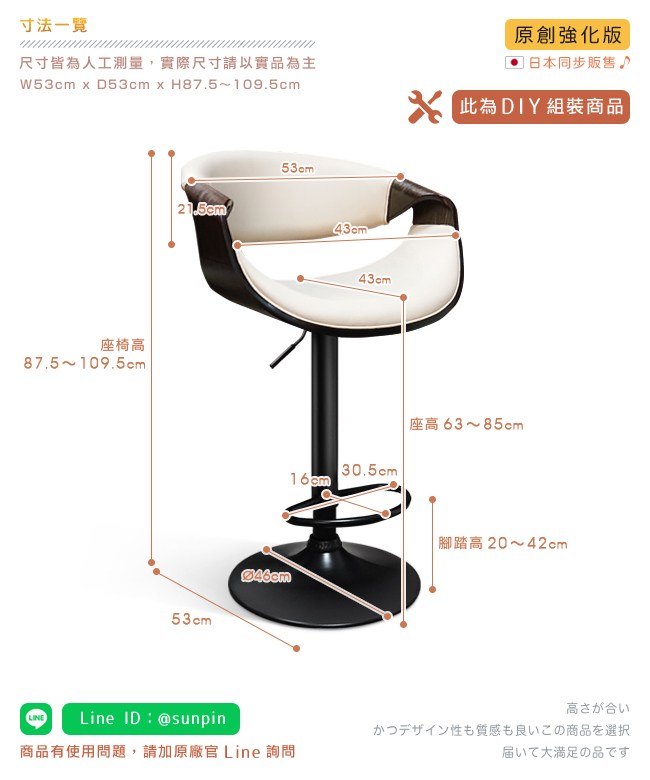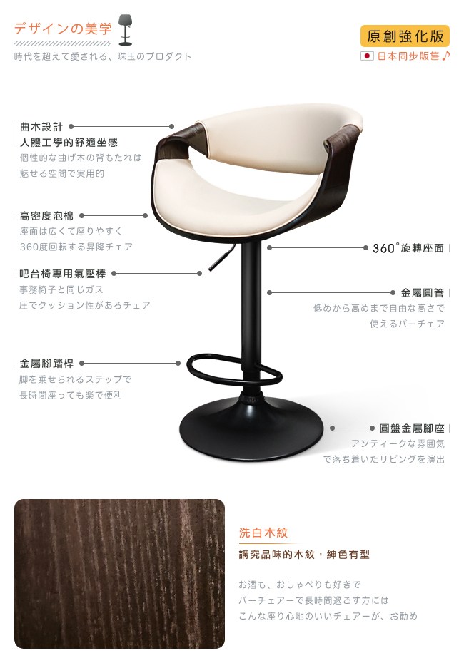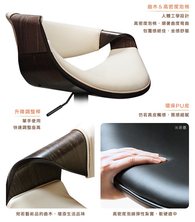 挑高的吧台椅,與眾不同的格調,提升用餐的氛圍。非常適合與廚房中島搭配,不佔空間,可以一邊料理美味食材,一邊與家人朋友談天說地,自然而然拉近彼此的距離。曲木的藝術設計與高密度泡綿,絕佳的包覆感,坐感舒適,久坐不累。環保 PU 皮,仿若真皮觸感,質感細膩。金屬霧面消光圓管,品味非凡,且抗氧化不易生鏽,經久耐用。隨個人喜好與身高,吧台椅可調高度 22cm,金屬腳踏桿方便雙腳踩踏。底座軟質止滑墊,增加抓地力,更加安全牢固,且可避免刮花地板。