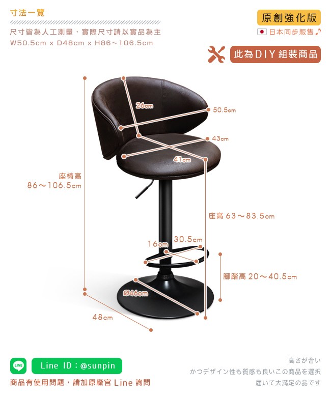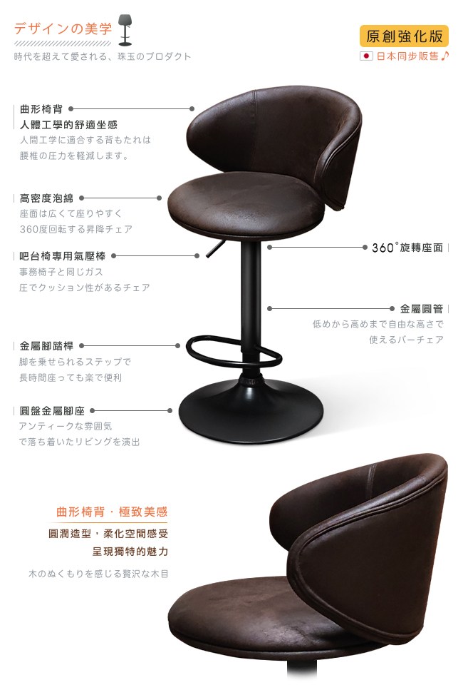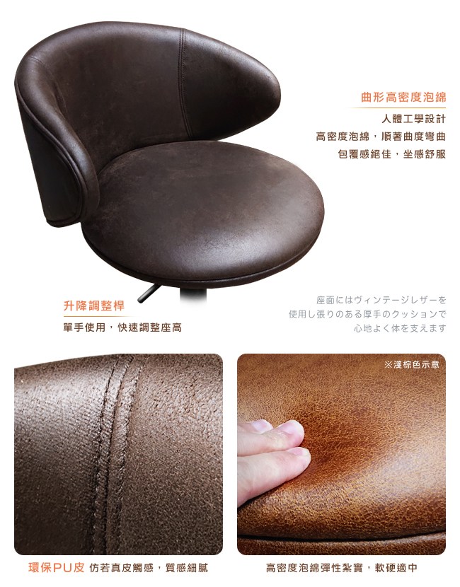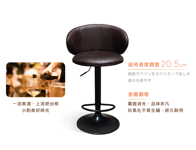 挑高的吧台椅,與眾不同的格調,提升用餐的氛圍。非常適合與廚房中島搭配,不佔空間,可以一邊料理美味食材,一邊與家人朋友談天說地,自然而然拉近彼此的距離。曲形椅背與高密度泡綿,貼合身型,絕佳的包覆感,坐感舒適,久坐不累。環保 PU 皮,仿若真皮觸感,質感細膩。金屬霧面消光圓管,品味非凡,且抗氧化不易生鏽,經久耐用。隨個人喜好與身高,吧台椅可調高度 20.5cm,金屬腳踏桿方便雙腳踩踏。底座軟質止滑墊增加抓地力,更加安全牢固,且可避免刮花地板。