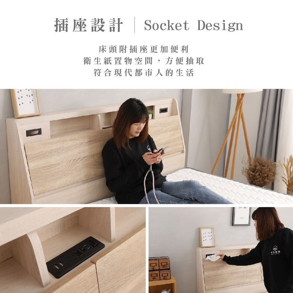 IHouse-山田 日式插座燈光房間三件組(床墊+床頭+六分床底)單大3.5尺梧桐