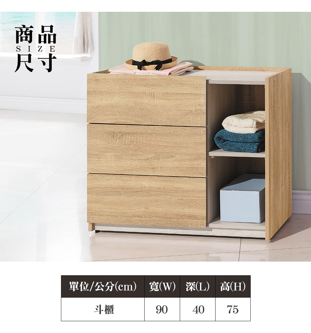 柏蒂家居-瑞莎3尺三斗櫃/三抽半開放收納置物櫃-90x40x75cm