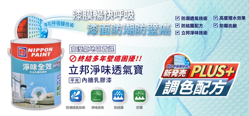立邦淨味「透氣寶」是專對潮濕多雨天候開發,以獨特「微孔呼吸漆膜」及「防結露配方」等「防潮透氣技術」,提供您預防及降低壁癌發生機率的新形態產品。此外,淨味「透氣寶」以無添加香精的「IPS+淨味技術」、高度撥水效果、加強抗鹼防黴,能強化預防壁癌發生的機會,保持潔淨居家環境,更能維護家人健康。