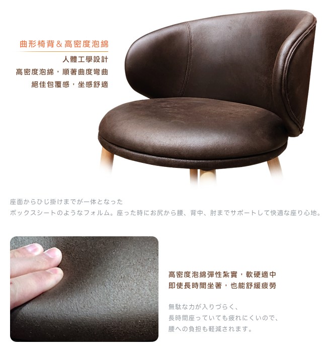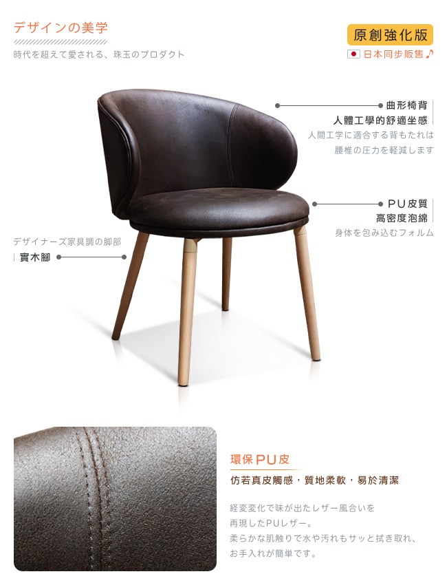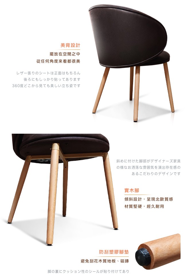 經典的北歐風格,呈現時尚、簡約、流線的設計感,不與世俗妥協,增添空間氛圍的有型魅力。環保 PU 皮,仿若真皮觸感,質感細膩。曲形椅背&高密度泡綿,順著曲度彎曲,絕佳的包覆感,坐感舒適。美背設計,擺放在空間之中,從任何角度來看都很美。實木腳材質堅硬,經久耐用。防刮塑膠腳墊可避免刮花木質地板、磁磚。
