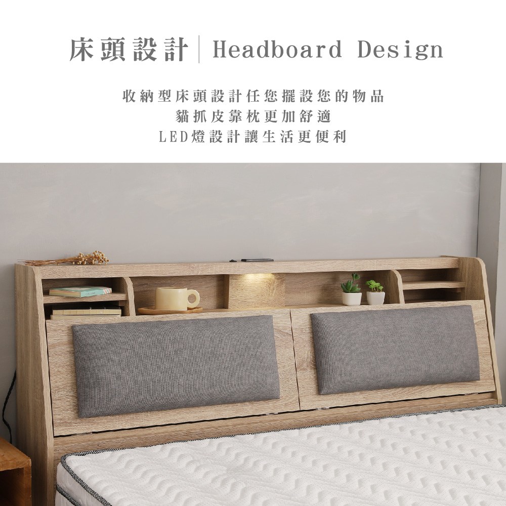 【藤原傢俬】白梧桐雙USB貓抓皮收納空間床組-單抽3.5尺單人加大(雙USB貓抓床頭+收納空間床底+單抽屜)