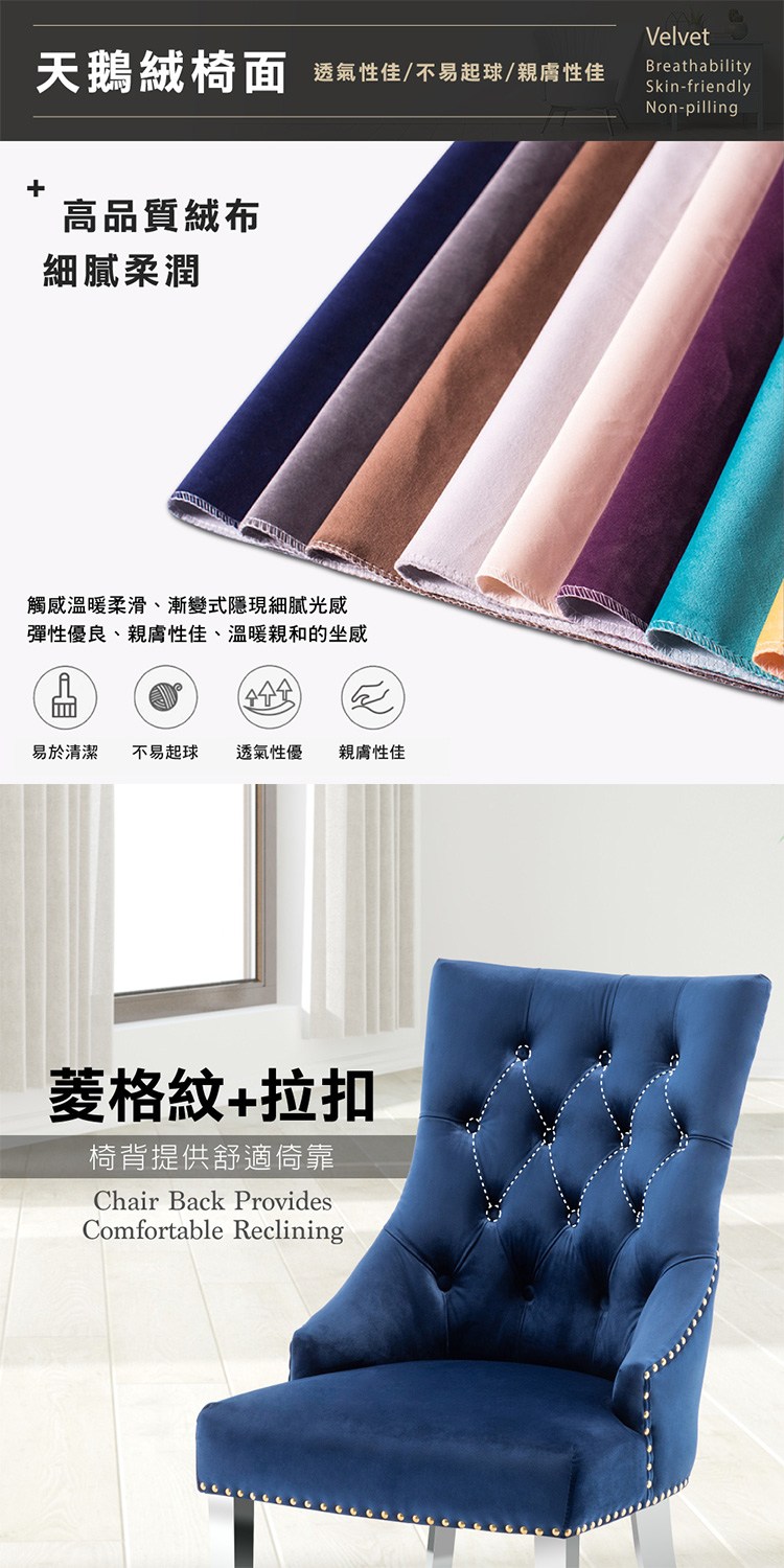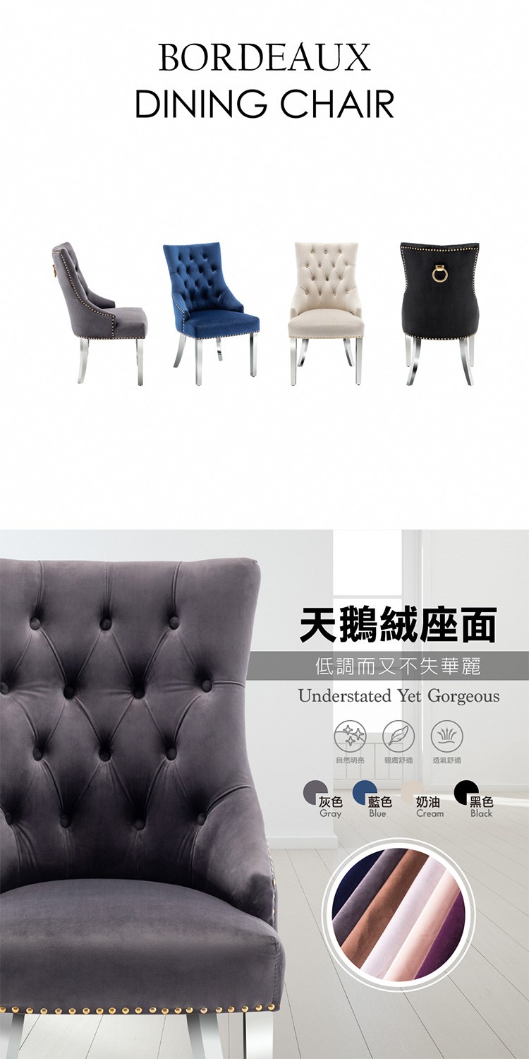 台灣與歐美同步販售、美規設計,低調而又不失華麗的天鵝絨座面,菱格紋配拉扣椅背提供舒適倚靠,