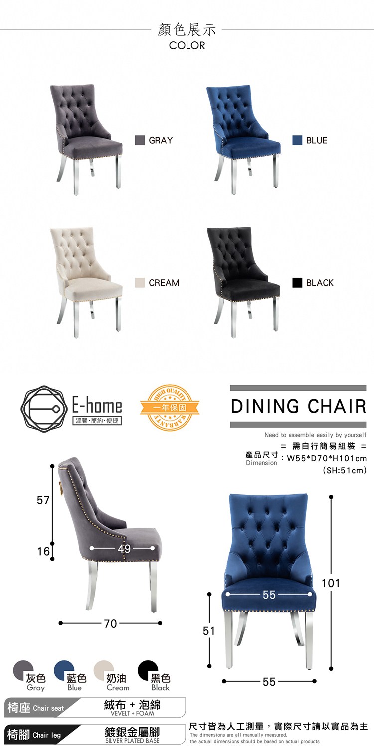 E-home Bordeaux波爾多絨布奢華拉扣微翼銀腳休閒餐椅-四色可選