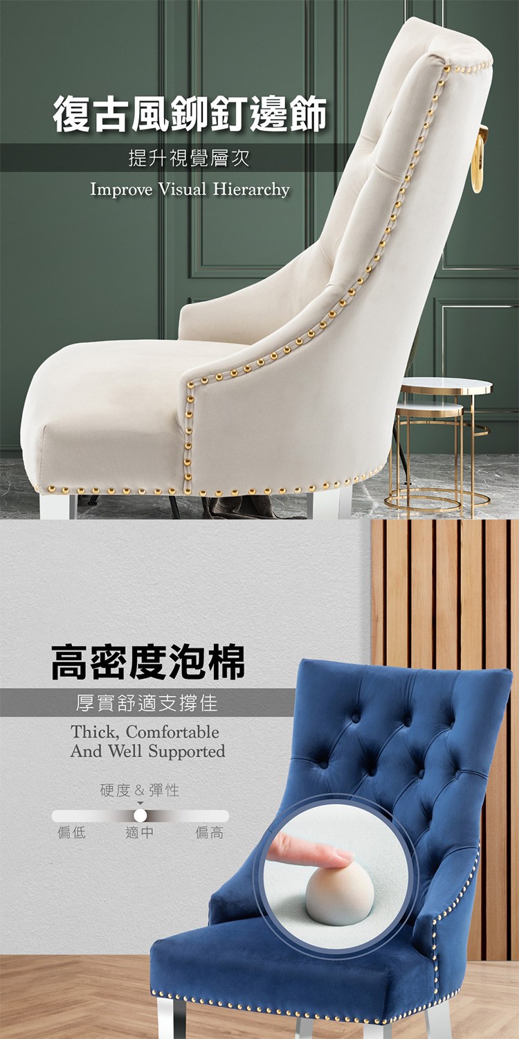厚實的高密度泡棉,舒適支撐佳,搭配簡潔線條鍍銀椅腳承重力強,附可微調及塑膠的腳墊不傷地板,