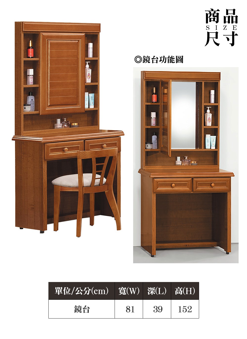 AS雅司-瓦麗實木2.7尺二抽鏡台-81*39*152cm-含椅
