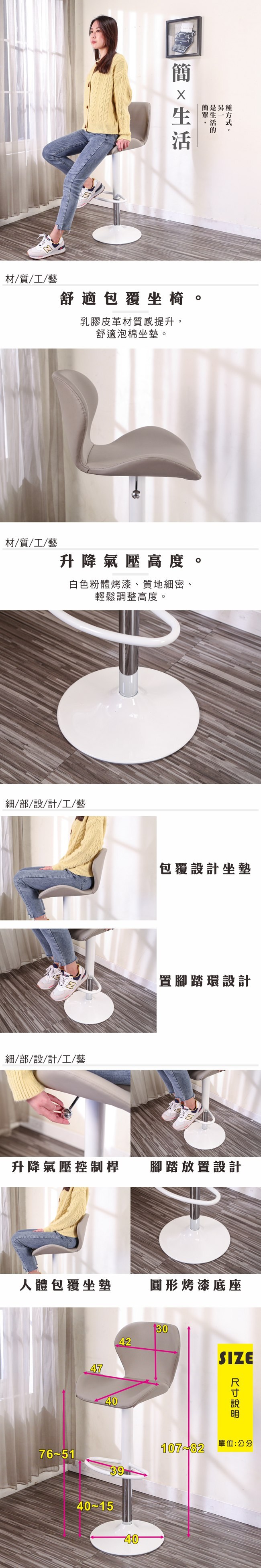 忙碌了一天之後,暫時拋下煩雜的工作,這個時候如果能小酌一杯,是不是能讓您心情更加沈靜,身體更加放鬆呢!又或者與家人喝杯香醇咖啡,分享一天的趣事,增進彼此之間的情感,。如果不想出去人擠人又想享受放鬆的LOUNGE BAR氣氛,現在,只要你擁有『升降吧台椅』就能享受這樣的氛圍。使用皮革加厚泡棉椅座,乘坐起來柔軟又舒適,還有靠背設計,坐起來也很舒適。黑砂支架搭配皮面座椅,整體搭配起來展現出沈穩高雅的時尚品味。座墊可360度旋轉及氣壓調整昇降,不受限使用者的身高,黑砂底盤,材質穩固耐用,更貼心附有金屬腳踏圈,讓您使用起來更加自在與便利。如此時尚及實用的吧台椅,居家及商業店面使用皆宜,高貴不貴,超值推薦給您。